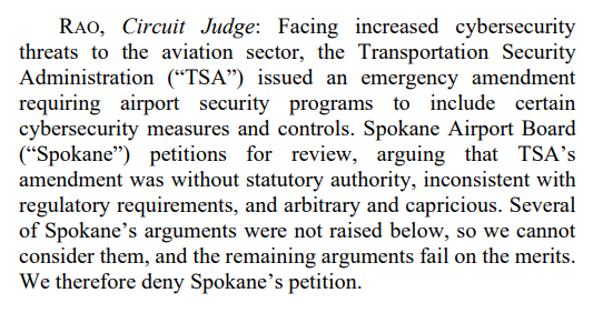 The second decision for the week is Spokane Airport Bd. v. TSA, No. 23-1155. It covers a host of issues, from statutory authority to arbitrary-and-capricious review to issue exhaustion. I cannot do better than the court’s opening summary: