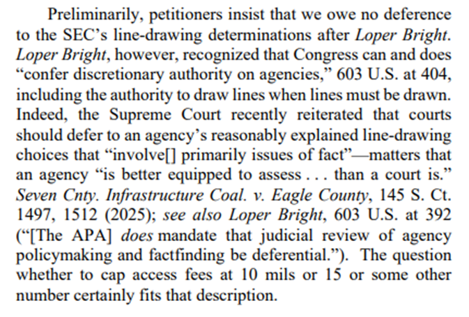 Here, the panel invokes the caveat to defer to SEC’s exercise of the fee-capping power it (by stipulation) possesses. That move is consistent with the Supreme Court’s recent Loper Bright decision: Seven County Infrastructure Coalition v. Eagle County. By contrast, in the passage that cites Adirondack, the panel seems to be using the caveat to defer to SEC’s judgment that it possesses fee-capping authority in the first place. It is doubtful that this sort of deference would be consistent with Loper Bright’s command that courts use “independent judgment . . . to determine the best reading of the statute.”