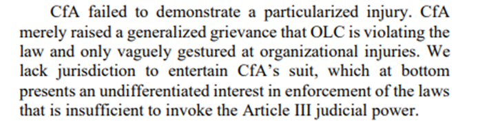 Also notable is Judge Rao’s concurrence in the judgment: she would have dismissed the plaintiff’s complaint for lack of standing. Unlike most FOIA suits—which concern an agency’s failure to respond to a FOIA request by the plaintiff—this suit sought to enforce an agency’s dury to make certain records available to the general public. Thus: